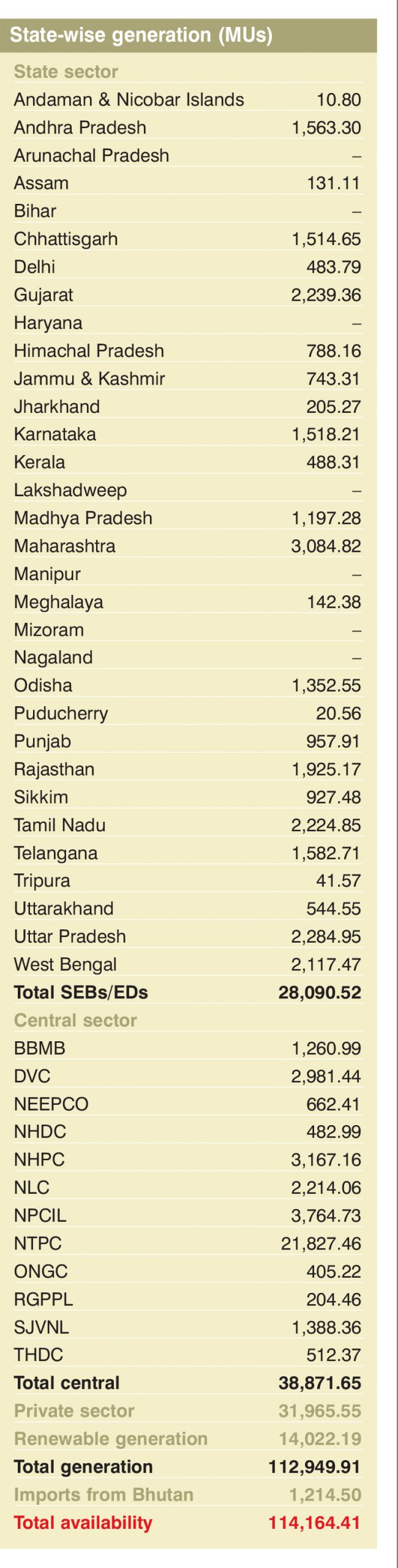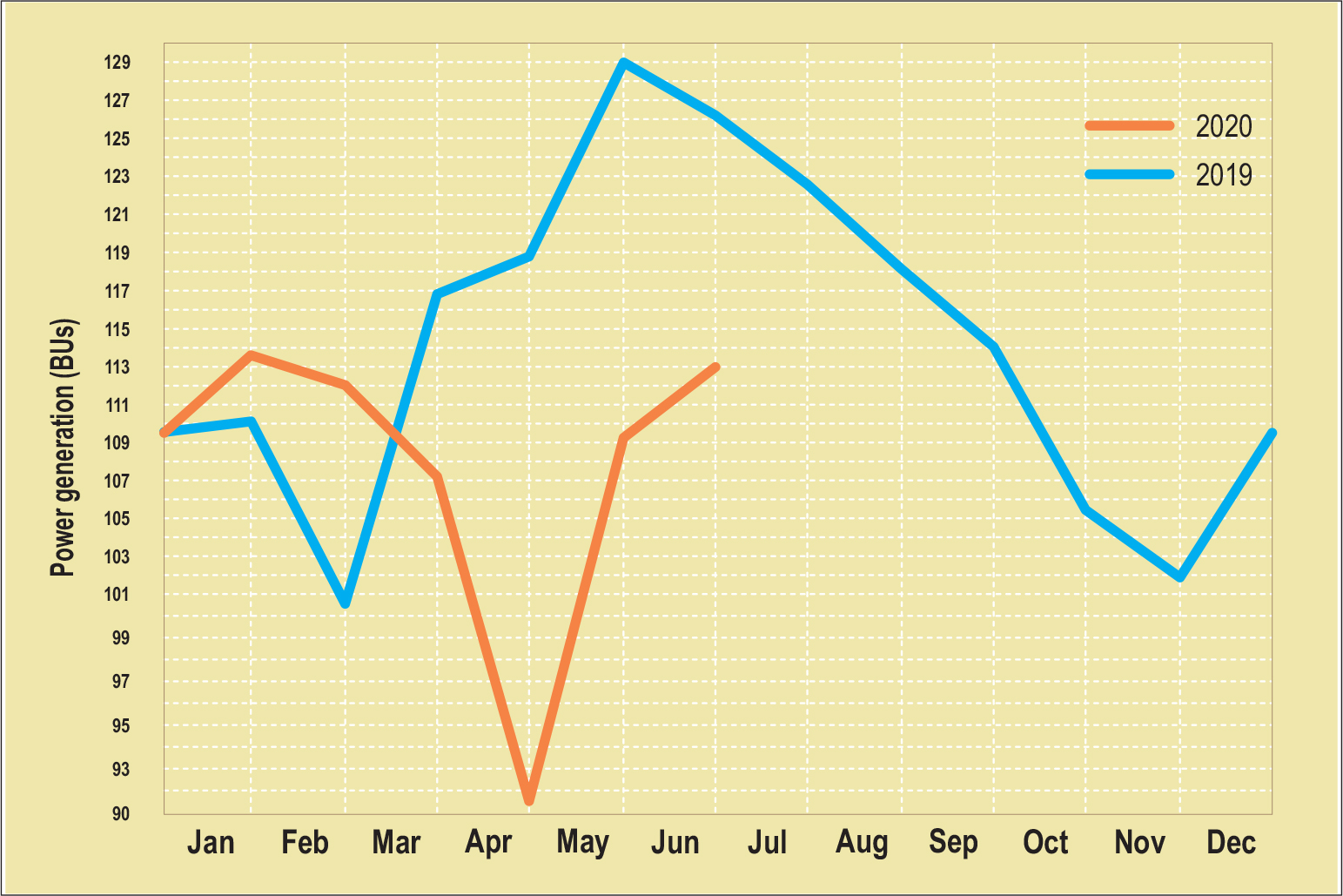 Total power generation stood at 112.95 BUs in June 2020. At around 38.87 BUs and 31.96 BUs, respectively the central and private sectors accounted for the major share in conventional power generation. Meanwhile, renewable energy generation stood at 14,022.19 MUs.