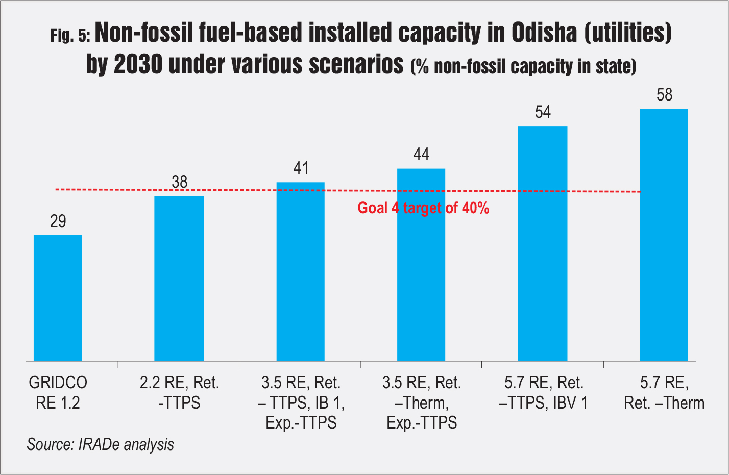 Fig. 4 shows the trend of total and specific emissions from the power sector in Odisha in 2030. It is evident that by increasing the renewable energy capacity and retiring older thermal power stations (TPSs) an effective decrease in emissions can be achieved. Fig. 5 gives the installed capacity of non-fossil fuel-based resources in the state (utilities only) by 2030. It is evident that at least 3.5 GW of renewable energy is needed to achieve the NDC Goal 4 target by 2030 in Odisha.