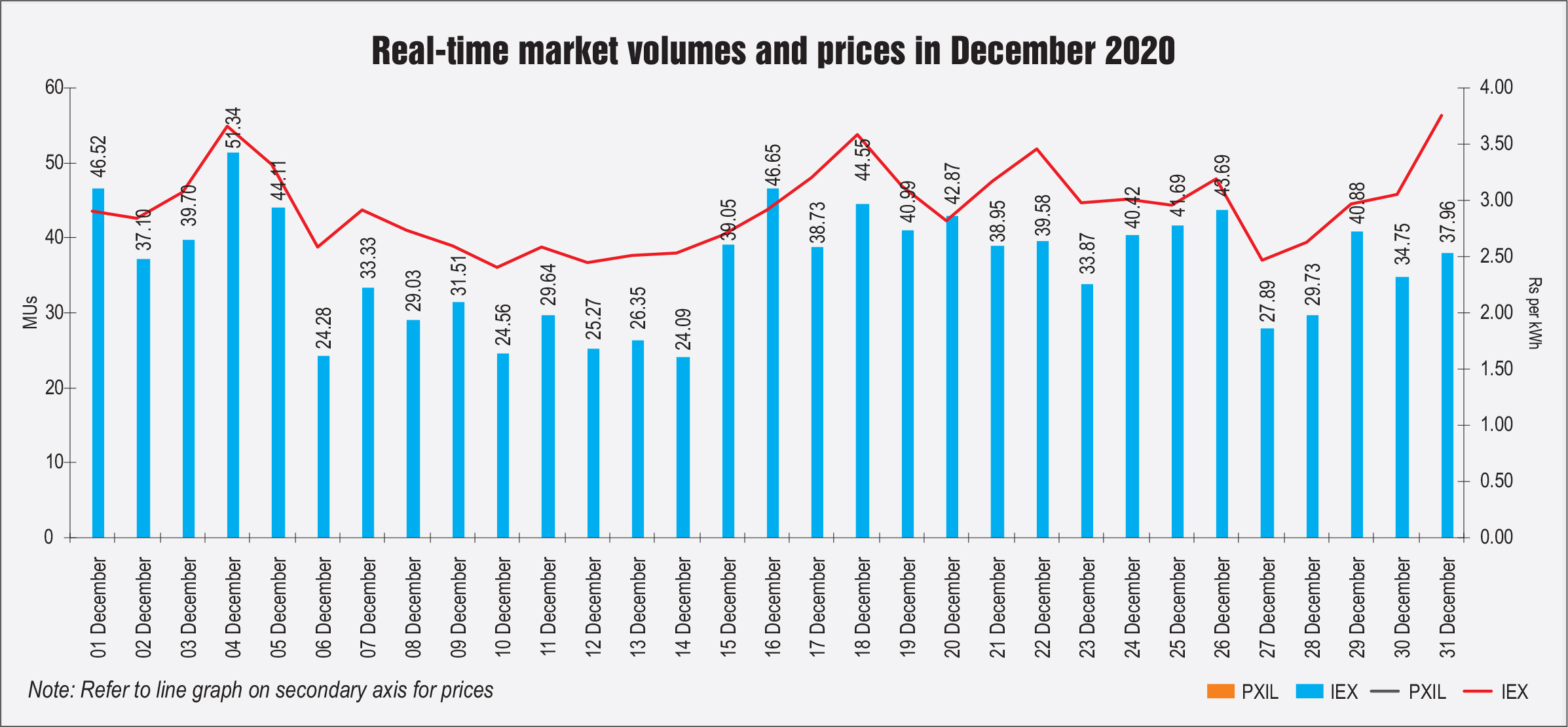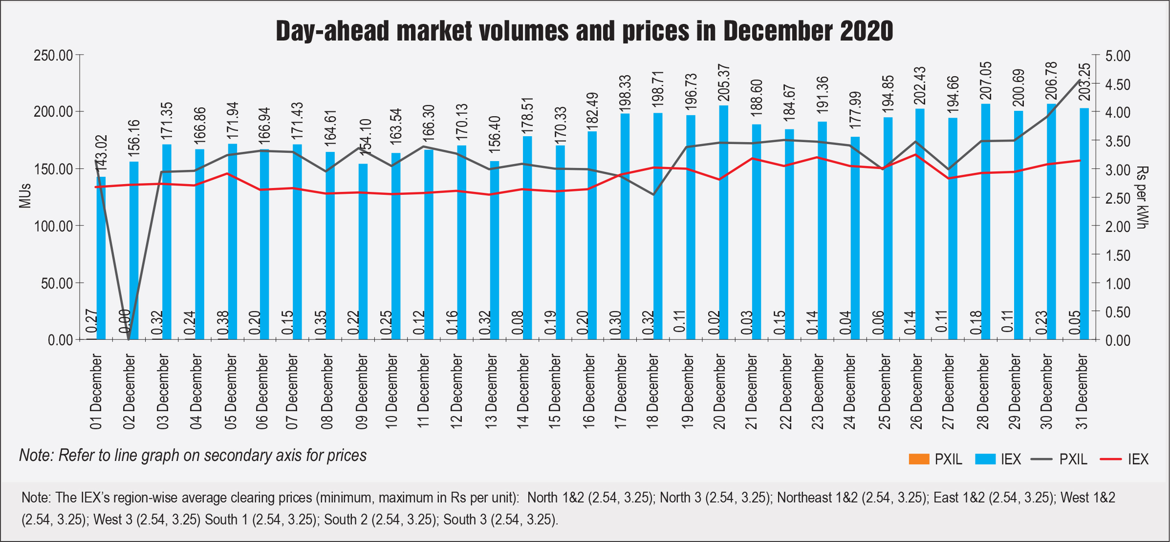 The electricity traded in the day-ahead market in December 2020 was 5,605.58 MUs at the IEX and 5.42 MUs at PXIL. The average market clearing price range was Rs 2.54 per unit to Rs 3.25 per unit at the IEX, and Rs 2.54 per unit to Rs 4.55 per unit at PXIL. The total volume traded in the real-time market in December 2020 was about 1,129.09 MUs at the IEX.