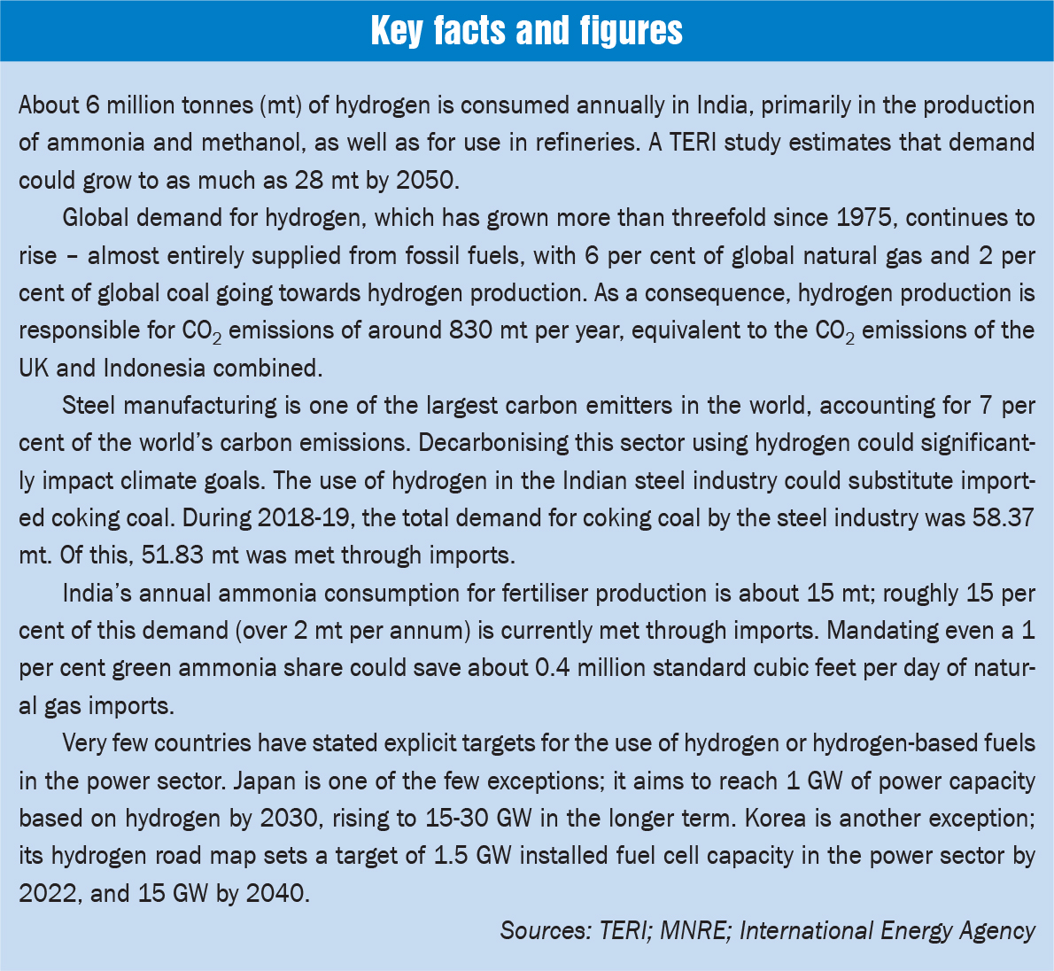 Steps have also been taken to promote hydrogen as an automotive fuel. In September 2020, the Ministry of Road Transport and Highways specified the safety and type approval requirements for hydrogen fuel cell vehicles in the Automotive Industry Standard (AIS) 157. In the same month, an 18 per cent blend of hydrogen with CNG (HCNG) was notified as an automotive fuel. There is also a likelihood of the inclusion of hydrogen fuel cell electric vehicles and hydrogen refuelling infrastructure under the centre’s flagship e-mobility scheme, FAME India Phase II (Faster Adoption and Manufacturing of Electric Vehicles in India Phase II). In May 2021, the Delhi High Court had issued a directive to the Department of Heavy Industry to consider hydrogen-based mobility under the scheme.