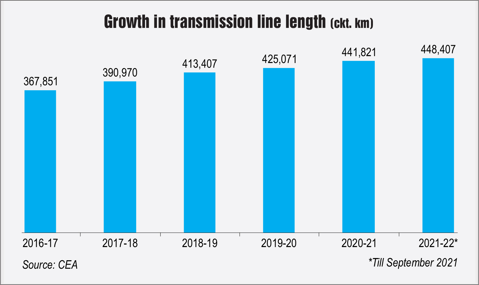The country’s transmission infrastructure has grown rapidly over the past few years. As of March 2021, the total transmission line length (at 220 kV and aboÂve) stood at 441,821 ckt. km. MeanÂwhile, the alternating current (AC) substation capacity stood at 995,968 MVA, and the HVDC substation capacity at 29,500 MW. Between 2013-14 and 2020-21, the transmission line length grew at a compound annual growth rate (CAGR) of 6.13 per cent; and the AC and HVDC substation capacity grew at 9.8 per cent and 11.8 per cent respectively. The interregional transfer capacity more than trebled from 33,950 MW in March 2014 to 105,050 MW in March 2021, recording a CAGR of 17.5 per cent. During 2021-22 (till September 2021), the transmission line length stood at 448,407 ckt. km, and AC and HVDC substation capacity at 1,027,391 MVA and 32,000 MW respectively. Further, the interregional transfer capacity stood at 110,750 MW.
