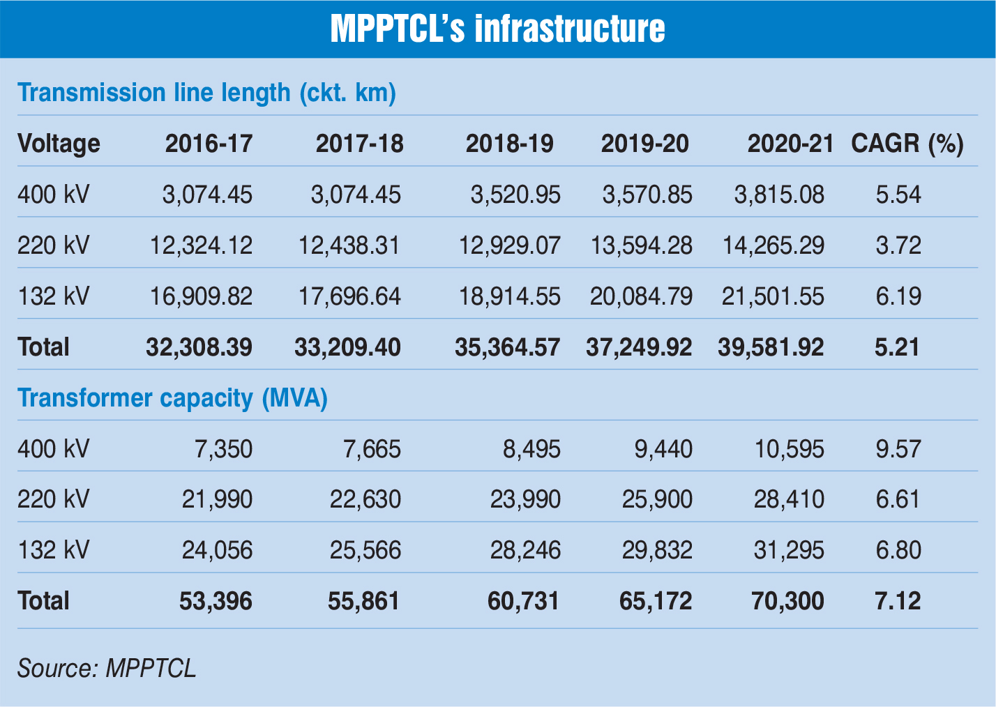 MPPTCL’s substation base, as of March 2021, stood at 396, an increase of 3.94 per cent from 2019-20. Of the total, 14 are 400 kV substations, 84 are 220 kV substations and the rest 298 are 132 kV substations. The total number of substations have grown at a CAGR of 4.66 per cent. Meanwhile, substation capacity stood at 70,300 MVA, as of March 2021. The capacity of 400 kV, 220 kV and 132 kV substations stand at 10,595 MVA, 28,410 MVA and 31,295 MVA respectively, growing at a CAGR of 9.57 per cent, 6.61 per cent and 6.8 per cent, respectively, from 2016-17 to 2020-21. The total substation capacity has increased at a CAGR of 7.87 per cent during the same period.