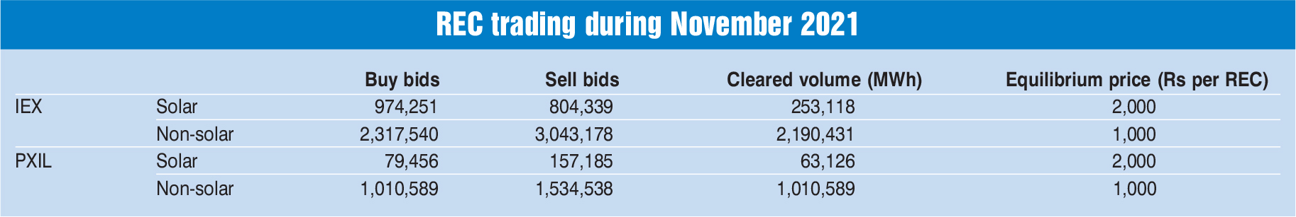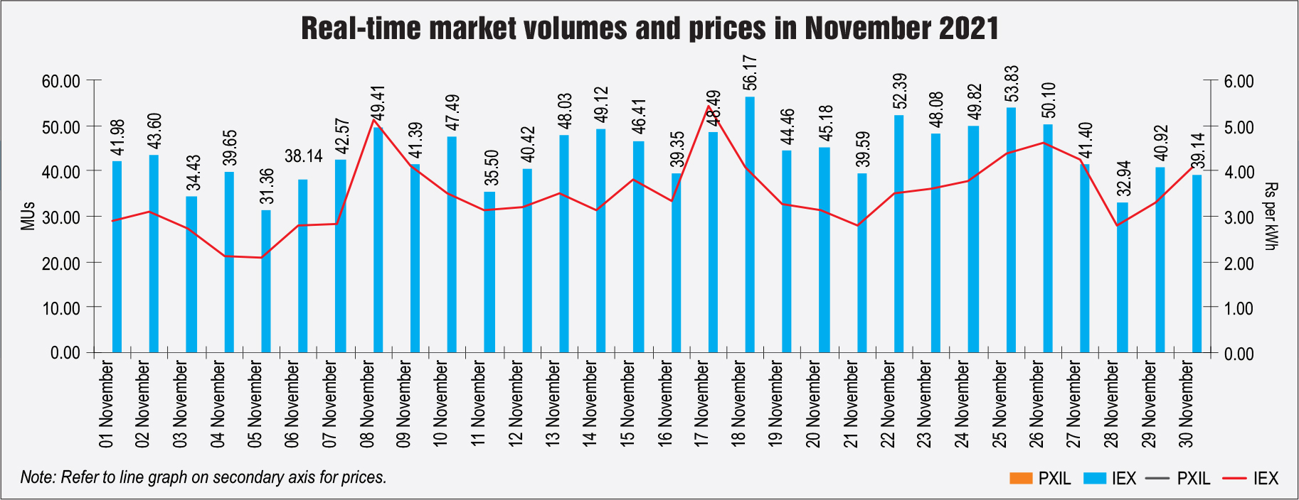 The electricity traded in the day-ahead market in November 2021 was 4,718.76 MUs at the IEX and 0.74 MUs at PXIL. The average market clearing price range was Rs 1.96 per unit to Rs 3.83 per unit at the IEX, and Rs 2.99 per unit to Rs 4.99 per unit at PXIL. The total volume traded in the real-time market in November 2021 was about 1,311.35 MUs at the IEX.