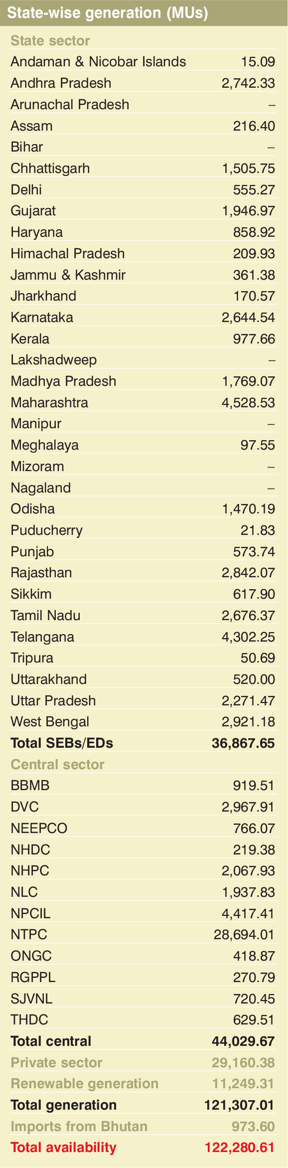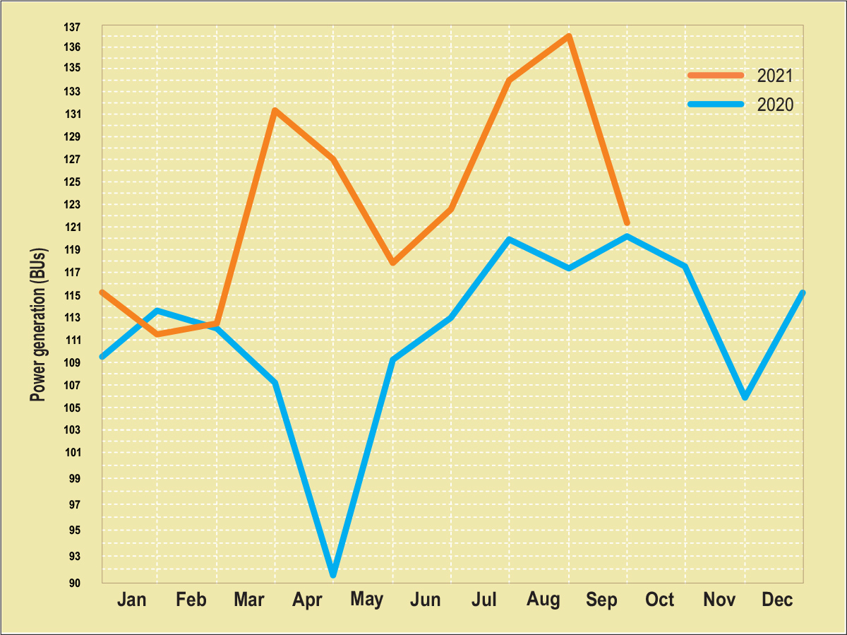Total power generation stood at 121.3 BUs in October 2021. At around 44.02 BUs and 36.86 BUs, the central and state sectors respectively accounted for the major share in conventional power generation. Meanwhile, renewable energy generation stood at 11,249.31 MUs.