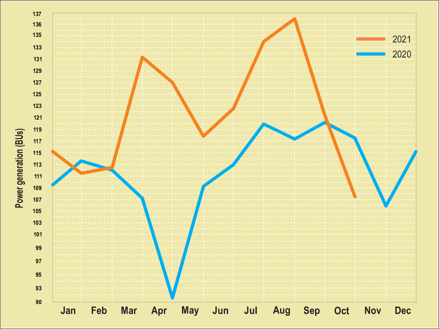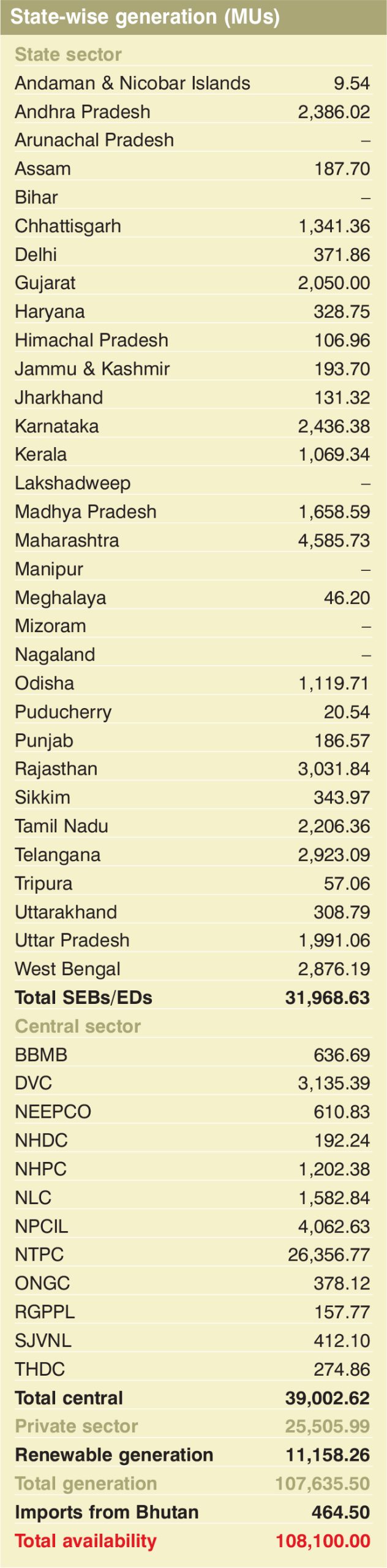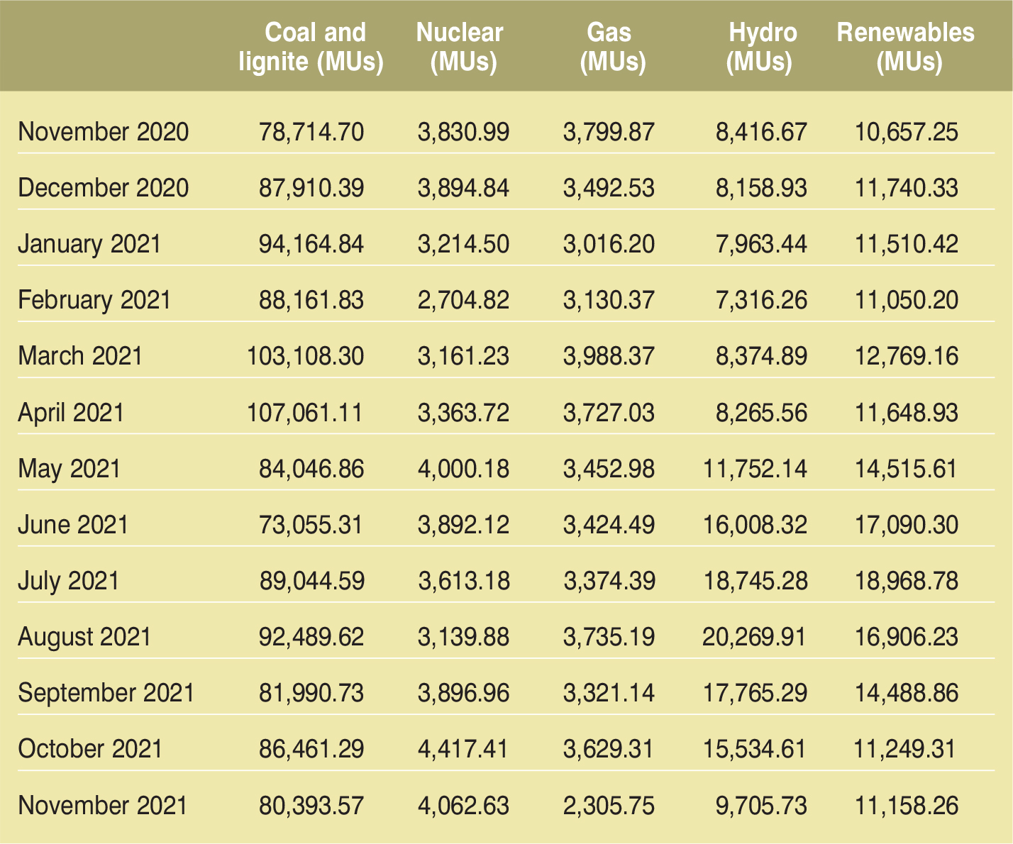 Total power generation stood at 107.64 BUs in November 2021. At around 39 BUs and 31.97 BUs respectively, the central and state sectors accounted for the major share in conventional power generation. Meanwhile, renewable energy generation stood at 11,158.26 MUs.