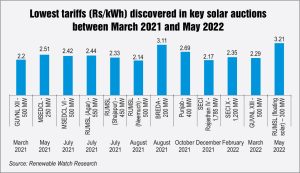 Among the solar auctions that have been undertaken so far since the beginning of 2022, the lowest tariff discovered has been Rs 2.29 per unit in GUVNL’s auction for 500 MW of solar projects (Phase XIII) in March 2022. Most recently, in May 2022, three winners were declared in RUMSL’s auction for the 600 MW floating solar park in the Omkareshwar reservoir in Madhya Pradesh. The auction was undertaken for the first phase of the project, encompassing a capacity of 300 MW. Amp Energy was awarded 100 MW at a quoted tariff of Rs 3.21 per kWh, NHDC was awarded 100 MW at a quoted tariff of Rs 3.22 per kWh and SJVN was awarded the remaining 100 MW capacity at Rs 3.26 per kWh. This is the highest discovered tariff in the past 15 months, and may be attributed to the higher costs of floating solar technology compared to ground-moun-ted projects. Further, the recently imposed basic customs duty on imported cells and modules, and the implementation of the Approved List of Models and Manufacturers (ALMM) have also impacted tariffs.