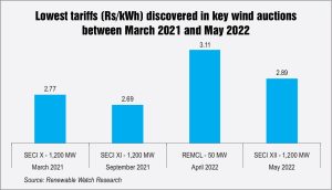 Wind tariffs are relatively higher than those discovered in solar and wind-solar hybrid auctions. In May 2022, NTPC Renewables, Halvad Renewables, JSW Neo Energy and Torrent Power won SECI’s auction for the 1.2 GW interstate transmission system (ISTS)-connected wind power projects (Tranche XII). NTPC Renewables quoted a tariff of Rs 2.89 per kWh while the rest quoted Rs 2.94 per kWh. The lowest tariff of 2021 was discovered in SECI’s auction for 1,200 MW of ISTS-connected wind power projects (Tranche XI) in September 2021. ReNew Power, Green Infra Wind Energy and Anupavan Renewables won capacities of 300 MW, 180 MW and 150 MW respectively at a quoted tariff of Rs 2.69 per kWh. The tariff was roughly 2.9 per cent lower than the lowest tariff discovered in SECI’s previous auction of 1,200 MW of ISTS-connected wind projects (Tranche X), held in March 2021, in which Adani Renewable Energy, which won 300 MW of capacity, had quoted a tariff of Rs 2.77 per kWh. The highest bid over the past one year was quoted by Sembcorp, which won the entire capacity of 50 MW in REMCL’s auction for power consumption of the railways for traction in Maharashtra at Rs 3.11 per kWh.