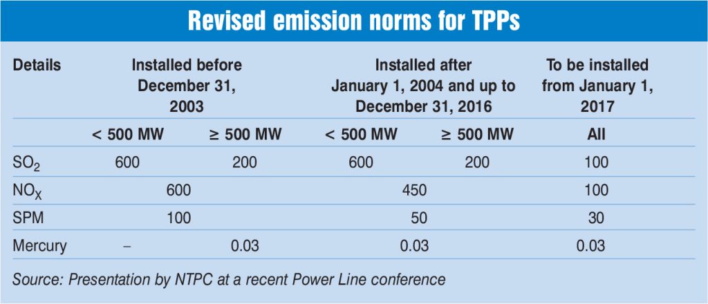 The Ministry of Environment, Forest and Climate Change (MoEFCC) notified the revised emission norms for particulate matter (PM), sulphur dioxide (SO2) and oxides of nitrogen for TPPs in December 2015, mandating TPPs to install emission control systems by December 2017. However, the deadline was pushed to December 2022 for all power stations in the country while power stations in the NCR were required to comply with the revised norms by December 2019.