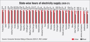 The national average hours of supply (HoS) stand at 23.52 hours in urban areas and at 20.89 hours in rural areas. Several discoms are providing 24 hours of electricity, higher than the national average, such as APCPDCL, the PuduÂcherry Electricity Department, Adani Electricity Mumbai Limited (AEML) and TPDDL in urban areas. Similarly, Uttar Gujarat Vij Company Limited (UGVCL), Dakshin Gujarat Vij Company Limited (DGVCL), Madhya Gujarat Vij Company Limited (MGVCL), KSEB Limited, APSPDCL and Andhra Pradesh Eastern Power Distribution Company Limited are providing 23.5 HoS in rural areas, which is higher than the national average. The DT average failure rate stands at 6.93 per cent with BYPL, BRPL, AEML, Tata PowÂer Company Limited, and BEST UnderÂtaking recording less than 1 per cent rate while Jammu Power DistribuÂtion CorpoÂration Limited and Kashmir Power Distribution CorporaÂtion Limited are at the higher end with a DT failure rate of over 26 per cent.