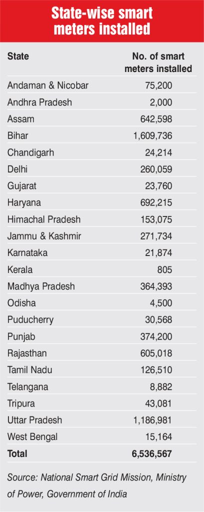 Smart metering is being actively promoted by the National Smart Grid Mission, Revamped Distribution Sector Scheme (RDSS), smart grid pilots and utility initiatives, among others. As of June 2023, a total of 22.98 million smart consumer meters have been sanctioned under various schemes, including the utility’s own initiatives, while 6.53 million meters have been installed. Uttar Pradesh has the highest number of installed smart meters in the country, at nearly 1.16 million, followed by Bihar (1.14 million).