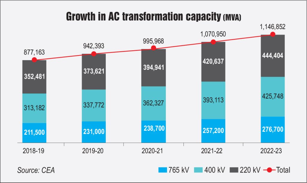 India’s alternating current (AC) transformation capacity has steadily increased over the years, reaching 1,158.27 GVA across the 220-765 kV levels in June 2023. Between 2018-19 and 2022-23, the AC transformation capacity demonstrated a compound annual growth rate (CAGR) of 6.9 per cent.