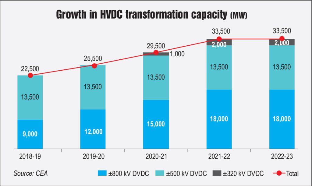 In addition, the high voltage direct current (HVDC) transformation capacity stands at 33,500 MW, of which the majority, 54 per cent, is at the ± 800 kV level; 40 per cent at the ± 500 kV level; and the remaining 6 per cent at the ± 320 kV level. Between 2018-19 and 2022-23, the HVDC transformation capacity experienced a CAGR of 10.5 per cent.