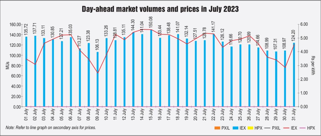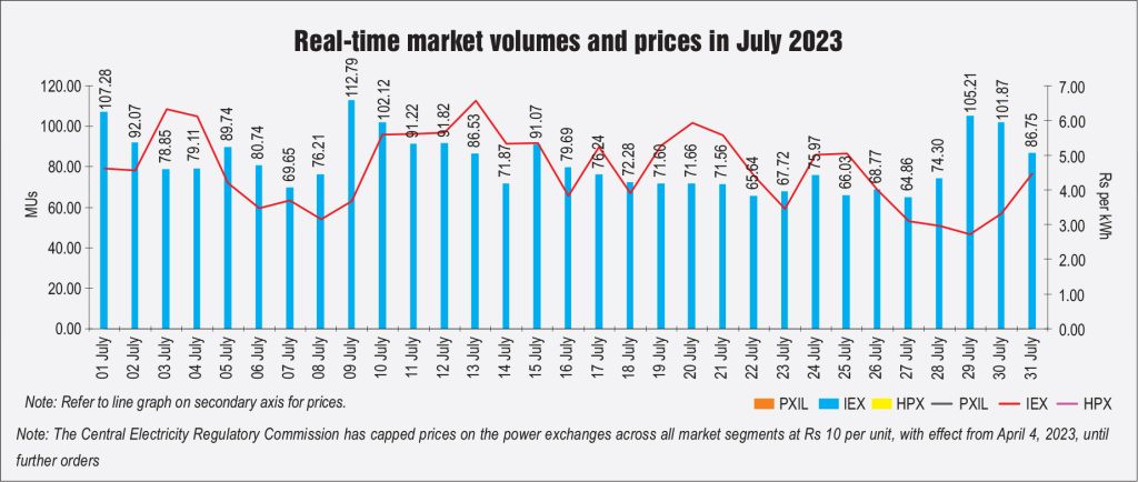 The electricity traded in the day-ahead market in July 2023 was 3,966.2 MUs at the IEX. The average market clearing price range was Rs 2.44 per unit to Rs 5.62 per unit at the IEX. The total volume traded in the real-time market in July 2023 was 2,541.23 MUs at the IEX.