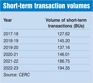 During 2022-23, approximately 33.8 BUs of electricity was transacted through traders, marking a decline of 14.4 per cent from the 39.47 BUs recorded during 2021-22.
