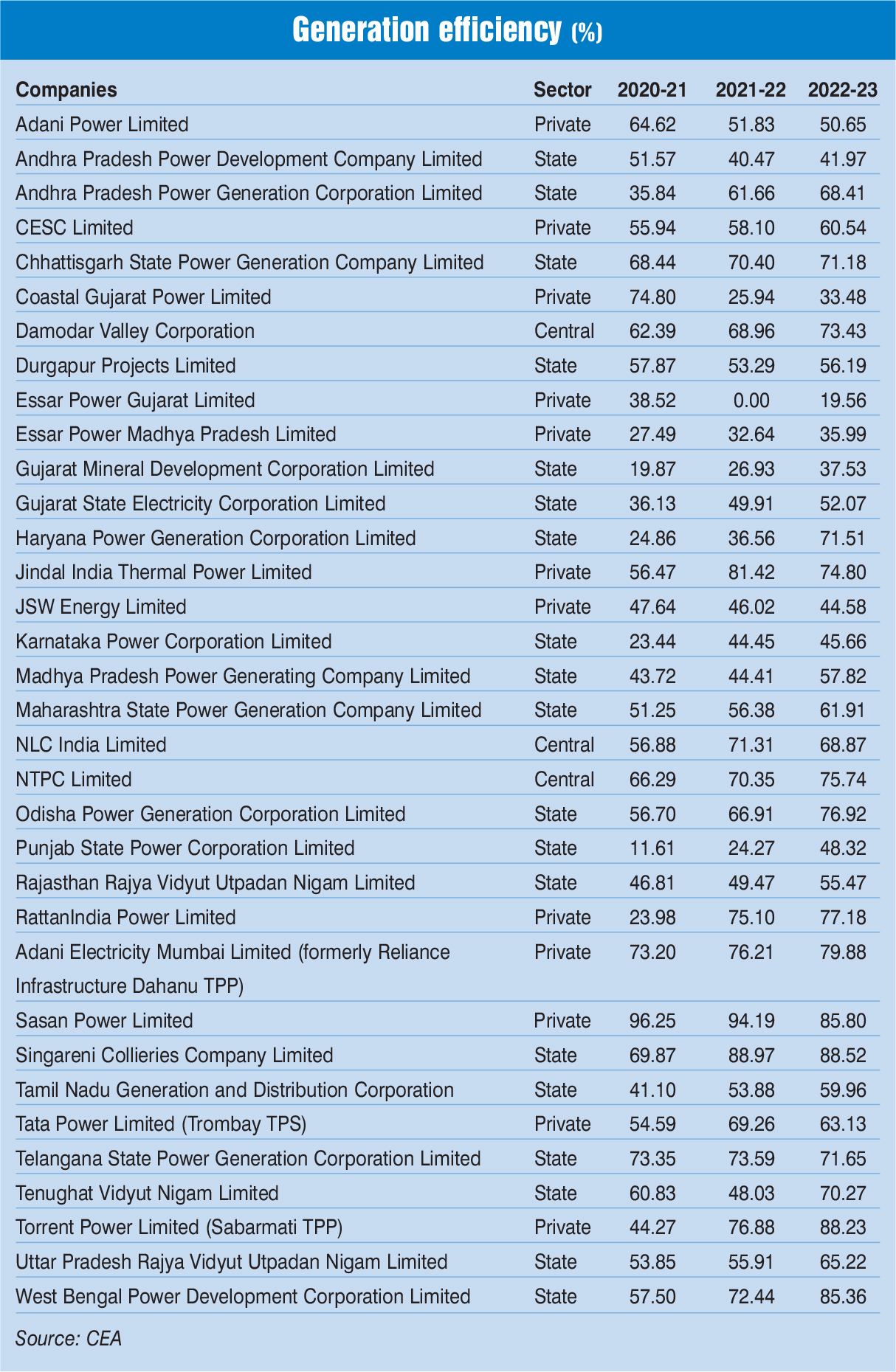 In the private sector, PLFs varied widely, ranging from 19.56 per cent to 88.23 per cent. CESC Limited, Essar Power MadhÂya Pradesh Limited, Essar Power Gujarat Limited, Coastal Gujarat Power Limited, RattanIndia Power Limited, Adani ElecÂtricity Mumbai Limited (AEML) (DahaÂnu TPP) and Torrent Power Limited (SaÂbarmati TPP) witnessed an increase in PLFs during the review period. All other private sector utilities registered a decÂline in their PLFs. Five private utilities reported PLFs higher than the national average. These are Jindal India Thermal Private Limited (JITPL), RaÂttÂanÂIndia, AEML, Sasan PowÂer Limited and Torrent Power LimiÂted (Sabarmati TPP). The highest year-on-year decline in PLF was reported by SaÂsan Power Limited, which saw its PLF go down from 94.19 per cent during 2021-22 to 85.8 per cent during 2022-23. MeÂanÂwhile, the highest year-on-year inÂcrease in PLF was reported by Essar Power Gujarat Limited, which registered a PLF of 19.56 per cent during 2022-23 from zero generation during 2021-22.