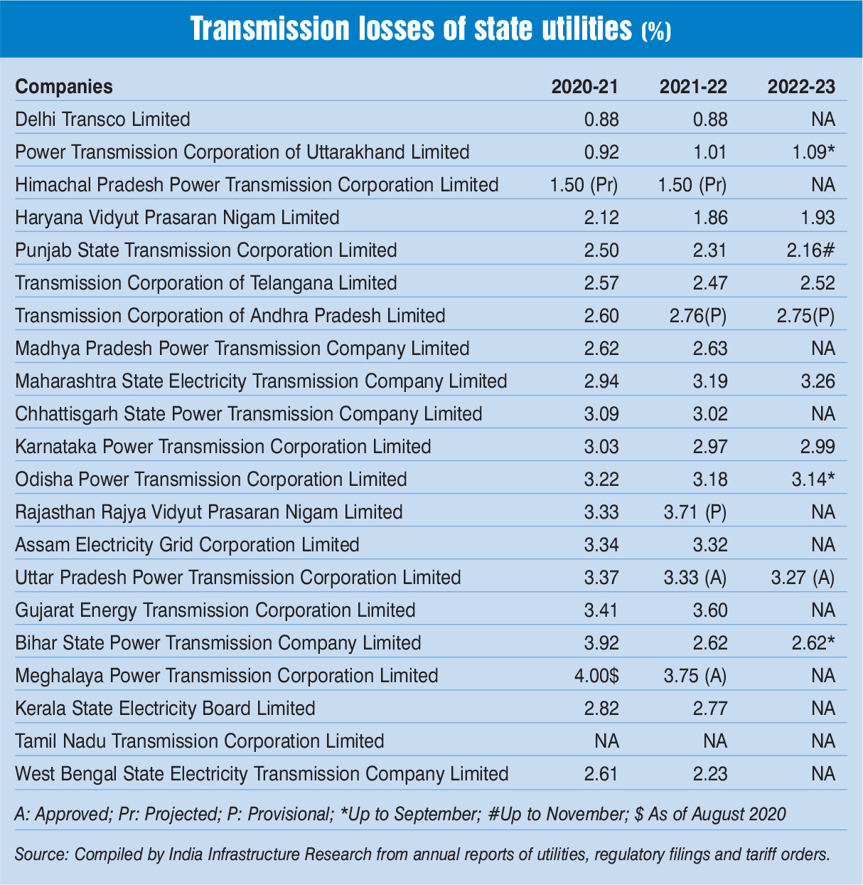 The performance of state transmission utilities exhibited a mixed trend during 2022-23, with utilities tracked by Power Line Research reporting transmission losses in the range of 1.09 per cent for Power Transmission Corporation of UttÂaÂrakhand Limited (PTCUL) to 3.27 per cent for Uttar Pradesh Power TransÂmiÂssion Corporation Limited (UPPTCL) during 2022-23.