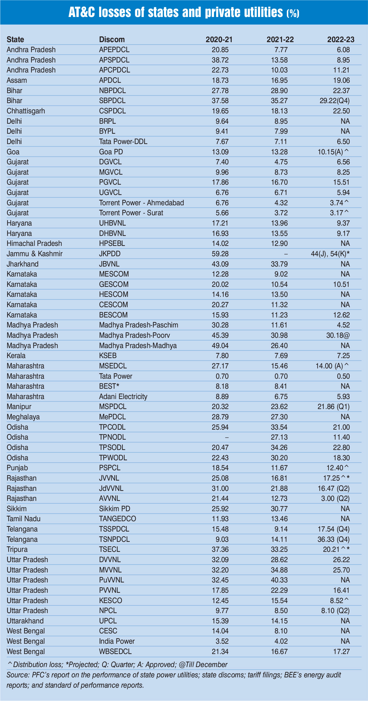 The worst performing state-owned utilities during 2022-23 were JKPDD, NorthÂern Power Distribution Company of Telangana Limited, and Madhya PradeÂsh Poorv Kshetra Vidyut Vitaran ComÂpaÂny Limited with AT&C losses of 54 per cent, 36.33 per cent and 30.18 per cent respectively.