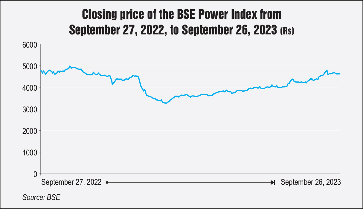 The Bombay Stock Exchange (BSE) Power Index tracks the price movement of 12 power companies operating across various segments of industry. As of September 27, 2023, the index stood at 4,618.79 points, registering a decline of around 3.17 per cent compared to SepÂtember 27, 2022, when the index was at 4,770.01 points. The 52-week high and low of the index was 4,988.04 points as of November 2, 2022 and 3,235 points as of February 27, 2023 respectively. In fact, the Power Index achieved an all-time high of 5,352.94 points during the past year on September 16, 2022. MeÂanwhile, the full market capitalisation Âof the index was around Rs 13,514.47 billion as on SepÂtember 26, 2023.