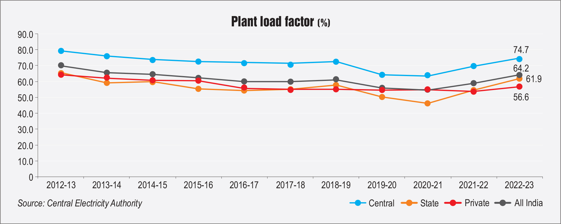 The national plant load factor (PLF) of thermal power stations registered an increase from 58.8 per cent in 2021-22 to 64.15 per cent in 2022-23.