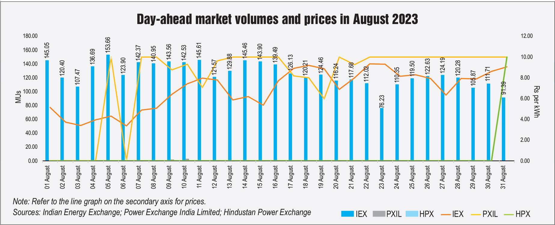 The electricity traded in the day-ahead market in August 2023 was 3,881.41 MUs at the IEX. The average market clearing price range was
