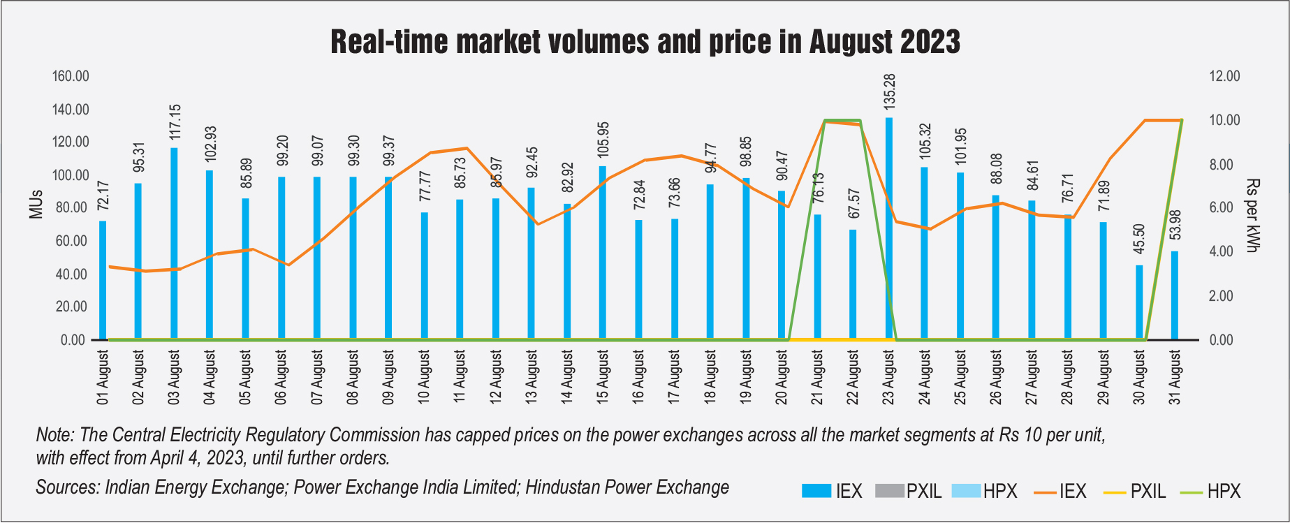 Rs 3.36 per unit to Rs 9.96 per unit at the IEX. The total volume traded in the real-time market in August 2023 was 2,738.8 MUs at the IEX.