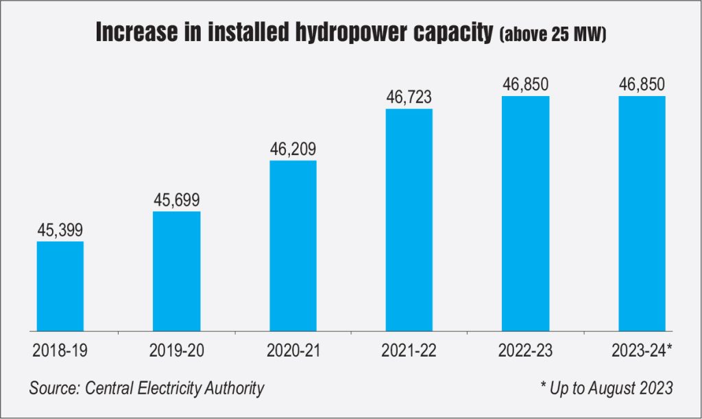 comprises 212 HEPs, with an aggregate installed capacity of 46.8 GW, including eight PSPs of approximately 4.7 GW. If small hyÂÂdropower is factored in, the overall installed hydro capacity reaches 51,832.92 MW, accounting for a 12.2 per cent share of the total installed capacity in the country. Between 2018-19 and 2022-23, the installed thermal power caÂpacity grew at a compound annual groÂwÂth rate of 1.2 per cent, while hydroÂpower grew at 0.8 per cent. In terms of generation, hydropower plants generated 162 BUs of electricity in 2022-23, approximately 7 per cent more than in the previous year. During April-August 2023, hydropower generation stood at nearly 74.4 BUs, reflecting a decrease of approximately 8.4 per cent compared to the same period in the previous year.