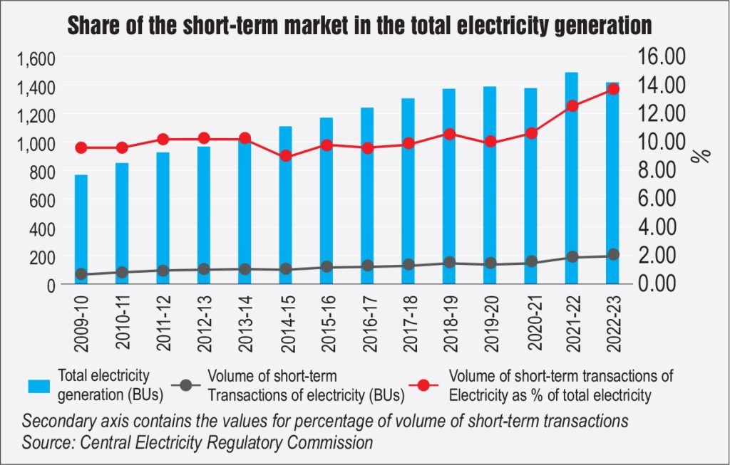 The share of short-term trading volumes in total generation (excluding generation from renewable energy and captive power plants) in 2022-23 was around 14 per cent, at around 194.34 BUs. The short-term market recorded a 4 per cent increase in volumes traded in 2022-23 compared to 2021-22.