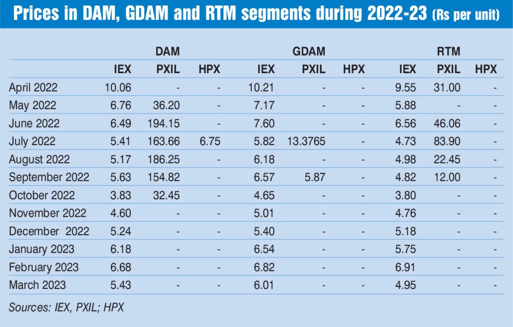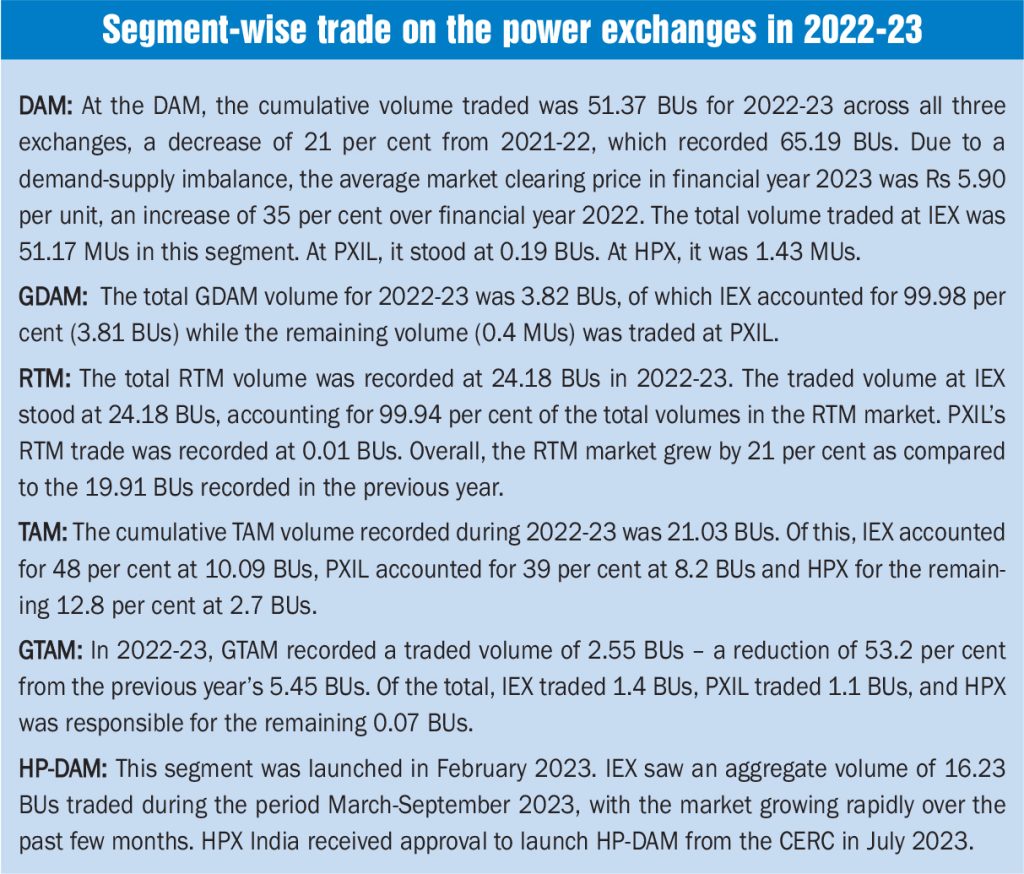 India has three power exchange platforms – Indian Energy Exchange (IEX), Power Exchange of India Ltd (PXIL) and Hindustan Power Exchange (HPX). The volume of transactions through the power exchanges reached 102.95 BUs in 2022-23, in all market segments – DAM, green DAM (GDAM), RTM, term-ahead market (TAM) and green TAM (GTAM).
