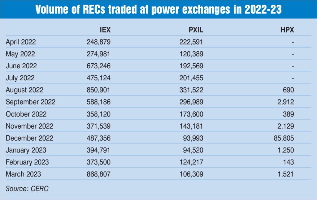 Renewable energy certificates: During 2022-23, 8.16 million renewable energy certificates (RECs) were traded across the three exchanges. The market volume of RECs traded at IEX accounted for 73 per cent of the total certificates traded, those at PXIL accounted for 26 per cent, and HPX had about a 1 per cent share.