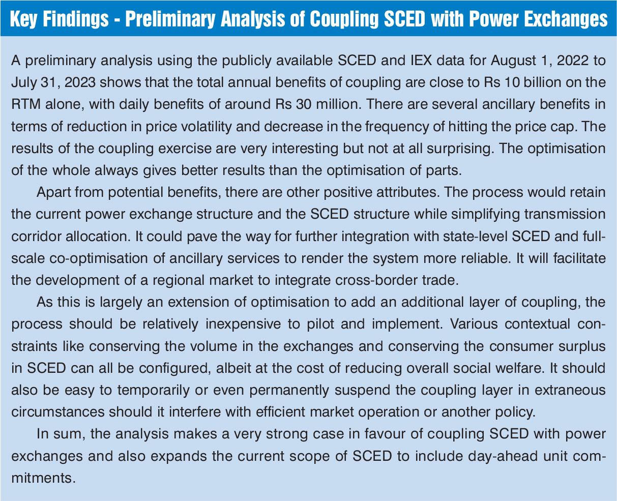 Market coupling will enhance competition, aligning with the Power Market Regulations’ long-standing objective of a multiple power exchange model, which involves product innovation, improved efficiency in service delivery, removal of entry barriers for new market infrastructure institutions, etc. If the SCED implementation experience is anything to go by, market coupling implementation should not be an expensive proposition, as it can be viewed largely as an extension of the SCED philosophy. It would preserve the autonomy of the power exchanges. Besides, the process can be designed flexibly so that the market coupling function can be suspended temporarily under unusual conditions.