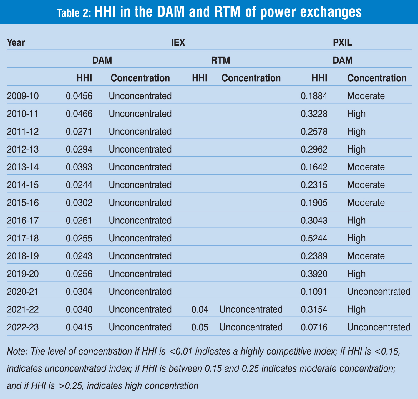 - The empirical evidence shows that in the DAM and RTM of the IEX, the concentration level was low/unconcentrated, indicating high competition among sellers in both markets during the enÂtire study period. In the DAM of PXIL, the concentration level was meÂdium to high, indicating moderate to low competition among sellers in the market.