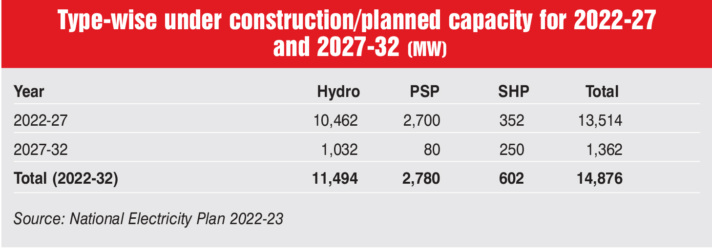 The outlook for hydropower in India is promising, with a projected 70 per cent increase in installed capacity by 2030 and nearly tripled capacity by 2047. The public sector is anticipated to maintain its dominance, contributing 78 per cent to new projects, while the private sector is expected to contribute 22 per cent. States play a crucial role, accounting for 44 per cent of the upcoming projects. According to the National Electricity Plan 2023, large hydro is expected to contribute approximately 17 per cent to the country’s projected renewable energy capacity (over 344 GW) by 2026-27. In the medium term (2022-27), 10,814 MW of conventional hydro projects and 2,700 MW of PSPs are expected, followed by 9,982 MW of conventional hydro and 19,240 MW of PSP capacity additions in 2027-32.