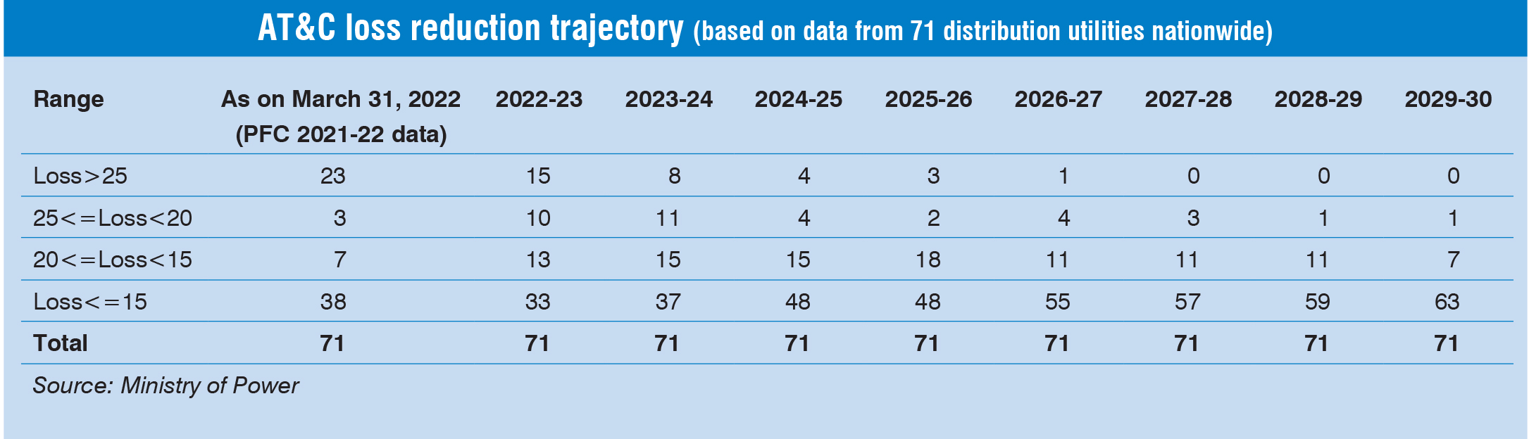 Aggregate technical and commercial (AT&C) losses serve as a measure of both the technical and the financial efficiency of distribution utilities. It displays the combined total of technical and commercial losses. The central government is actively pushing states to decrease their AT&C losses through the Revamped Distribution Sector Scheme (RDSS), which aims to reduce these losses to the national range of 12-15 per cent and close the gap between the average cost of supply and the aggregate revenue requirement by fiscal year 2024-25.