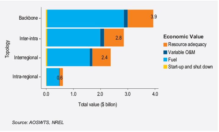 After studying the total economic value in 2050 for each interlinked transmission topology compared to the radial topology, and the breakdown of value by category, the study concluded that the majority of the benefits are associated with production cost savings, which include fuel, operations and maintenance (O&M), and start-up and shutdown costs.