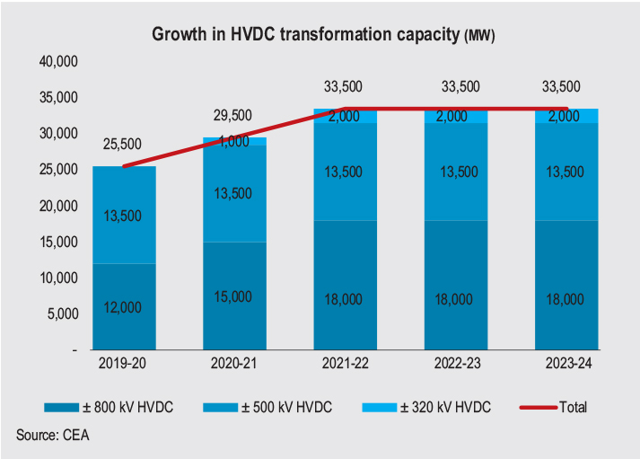 In addition, the high voltage direct current (HVDC) transformation capacity stands at 33,500 MW, of which the majority, 54 per cent, is at the ± 800 kV level; while 40 per cent is at the ± 500 kV level and the remaining 6 per cent at the ± 320 kV level. Between 2018-19 and 2023-24, the HVDC transformation capacity experienced a CAGR of 8.3 per cent.