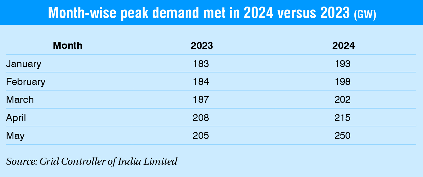 In the prevailing heatwave conditions, the northern and western regions met a record demand met of 86.7 GW and 74.8 GW respectively. However, the peak demand for the northern region, which was a new high of 89 GW on June 17, 2024. Notably, the all-India non-solar demand that was met touched an all-time high of 234.3 GW on May 29, 2024. At the same time, the all-India thermal generation that was met stood at 176 GW (ex-bus) of the peak demand, especially during non-solar hours. The steady and extensive support from thermal plants in meeting the power demand was made possible with the implementation of Section 11 of the Electricity Act, 2003, directing imported coal-based plants to maximise generation and revive gas-based power plants, alongside directives to gencos to schedule maintenance in a way that minimises partial and forced shutdowns. Renewable energy, including solar during solar hours and wind during non-solar hours, complemented thermal generation in meeting the peak demand. An analysis of source-wise power generation on May 30, 2024, as per Grid Controller of India Limited, indicates that thermal generation accounted for 74 per cent of the total generation (thermal and lignite 70 per cent; and gas, diesel and naphtha 4 per cent), while non-fossil fuel-based generation accounted for the remaining 26 per cent (renewable energy sources, including wind, solar and biomass, with 15 per cent; hydropower 9 per cent and nuclear 2 per cent).