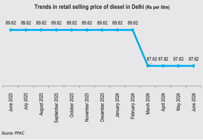 According to the Petroleum Planning and Analysis Cell (PPAC), the retail selling price of diesel in Delhi was Rs 87.62 per litre in June 2024 as against Rs 89.62 per litre in June 2023, marking a