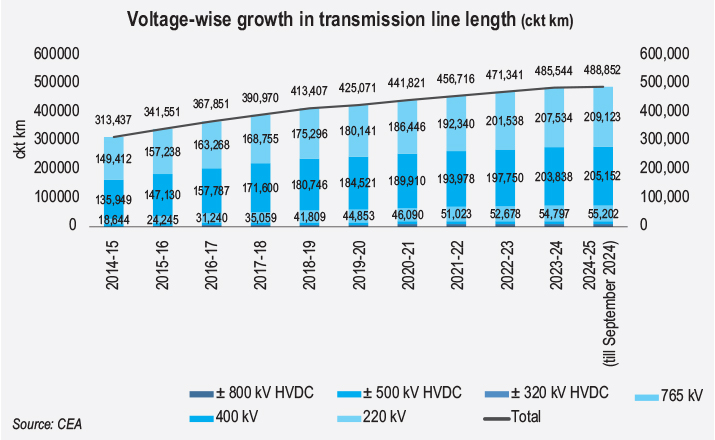 As of September 2024, the total length of transmission lines at the 220 kV and above levels stood at 488,852 ckt km, comprising 55,202 ckt km at the 765 kV level, 205,152 ckt km at the 400 kV level and 209,123 ckt km at the 230/220 kV level. At the high voltage direct current (HVDC) level, line length stood at 9,655 ckt km at the ±800 kV level, 9,432 ckt km at the ±500 kV level and 288 ckt km at the ± 320 kV level.