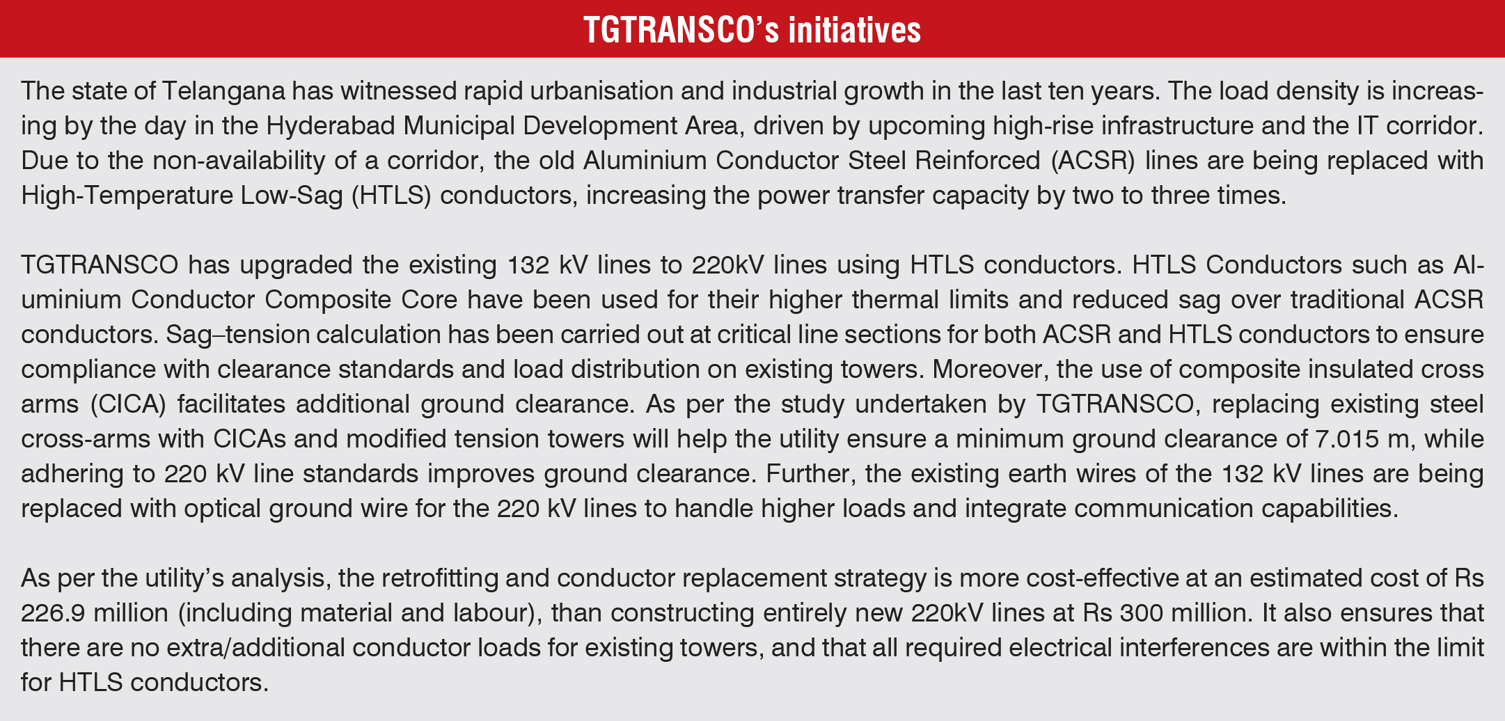 The industry is increasingly turning to advanced conductors such as high temperature lowsag (HTLS) conductors, which can carry more current at higher operating temperatures without significant sag. By upgrading transmission voltages to the next level and replacing existing conventional conductors with HTLS conductors, the power transfer capacity of transmission lines can increase significantly. This capability allows for the reconductoring of ageing transmission lines to boost capacity without requiring new infrastructure, saving both time and costs.