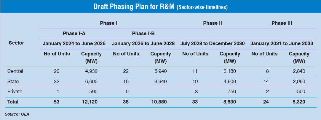 A draft phasing plan for 148 units and tentative timelines for the implementation of R&M/LE intervention have been prepared. As per Phase I-A of the plan, all units over 35 years of age are proposed to undergo R&M/LE works by June 2026, while under Phase I-B of the plan, all units between 30 and 35 years of age are proposed to undergo R&M/LE works by June 2028. In Phase II, thermal units between 25 and 30 years of age are to undergo R&M by December 2030, while units between 20 and 25 years of age are to complete the process by June 2033.