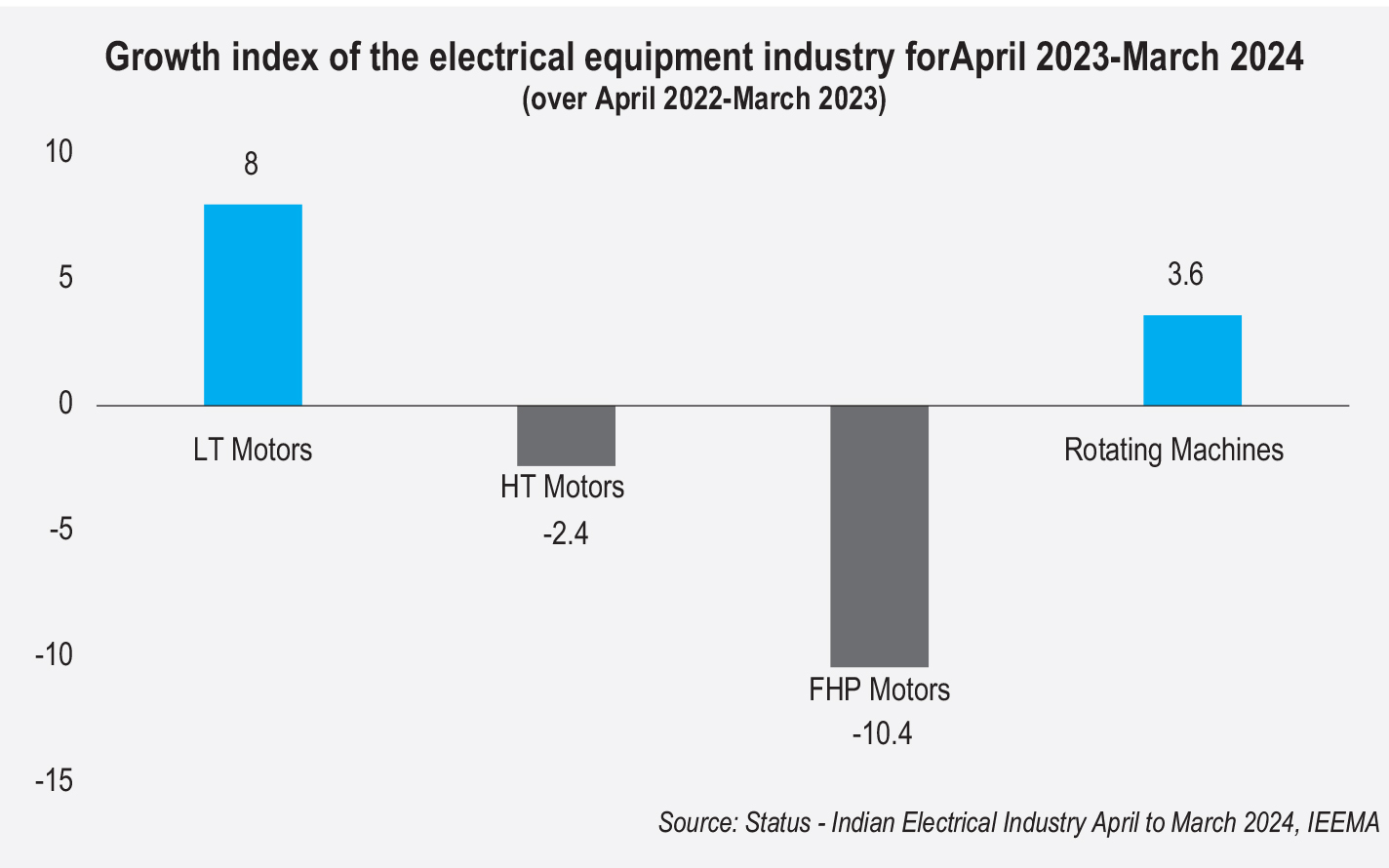 While the overall category of rotating machines grew by 3.6 per cent, this growth was primarily driven by low tension (LT) motors, which saw an 8 per cent increase. In contrast, high tension (HT) motors experienced a 2.4 per cent decline and fractional horsepower (FHP) motors saw a 10.4 per cent drop. Industrial demand has been shifting towards high efficiency LT motors, indicating a growing preference for LT motors.