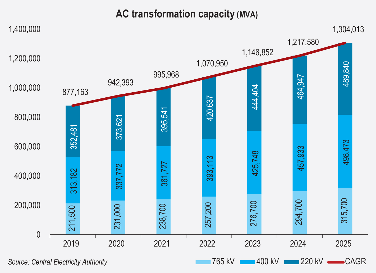 The pace of new substation capacity addition at the 220 kV and above voltages has increased significantly. According to data from the Central Electricity Authority (CEA), India added an impressive 86,433 MVA of transformation capacity in 2024-25, which was 22.2 per cent higher than the 70,728 MVA added in 2023-24. As of March 2025, the AC transformation capacity was around 1,304 GVA for voltage levels between 220 kV and 765 kV, witnessing a compound annual growth rate (CAGR) of 5.82 per cent from 2018-19. In AC transmission systems, 765 kV is the highest voltage level at which a transmission line operates.