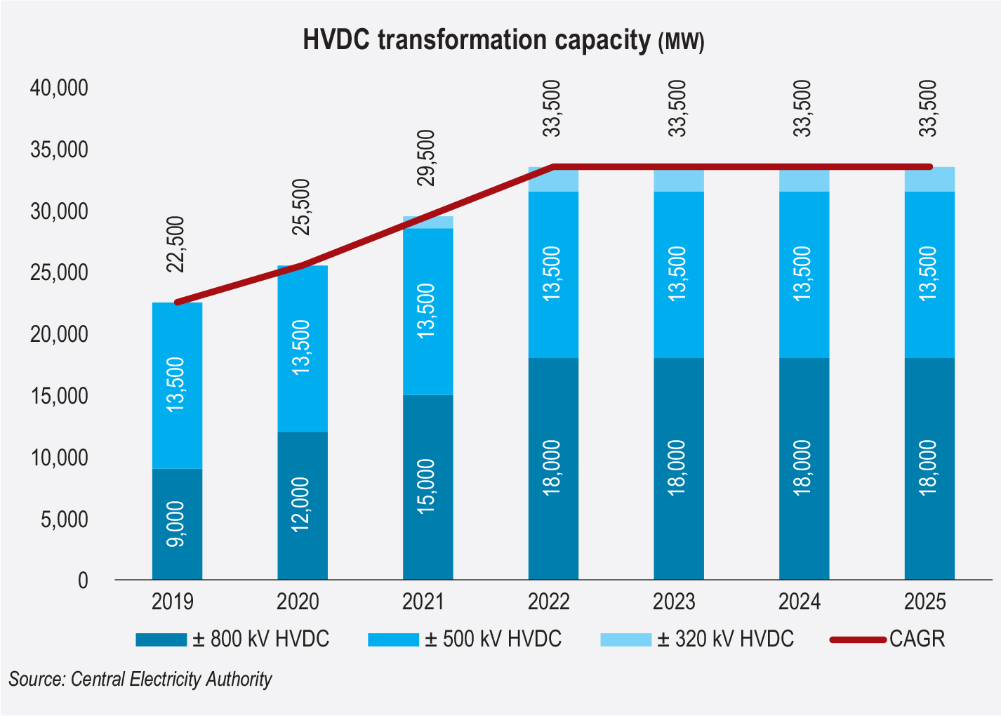 As of March 2025, the high-voltage direct current (HVDC) transformation capacity stood at 33,500 MW for voltage levels between ± 320 kV and ± 800 kV, with a CAGR of 5.85 per cent during 2018-19. The ± 800 kV level had a share of around 53.7 per cent, followed by ± 500 kV with 40.2 per cent and ± 320 kV with 5.9 per cent.