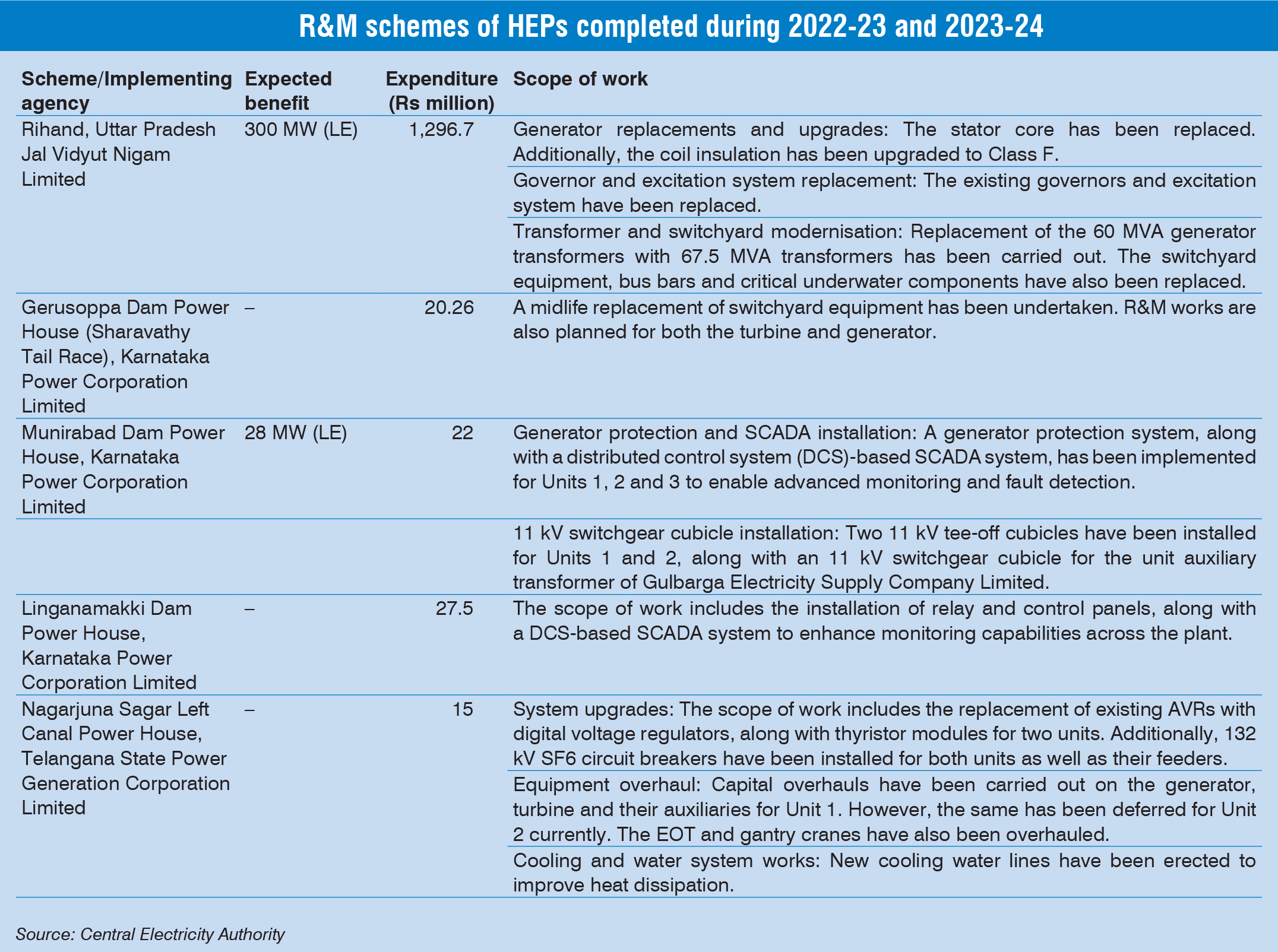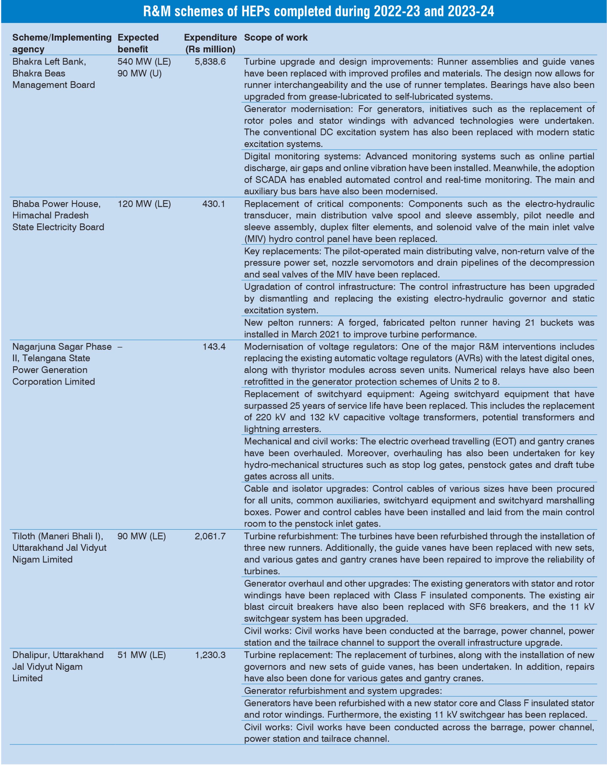 In recent years, hydropower has gained traction due to its low-cost energy generation. The importance of renovation and modernisation (R&M) in preserving and enhancing this value cannot be understated. Hydropower projects, unlike most generation technologies, have considerably longer lifespans. However, to maintain plant performance, R&M activities are required every 30-35 years. Timely renovation, modernisation, uprating and life extension (RMU&LE) can increase the lifespan of a hydropower plant by 20-25 years, bringing improved reliability and availability. As utilities face financial constraints that limit investment in new capacity, R&M programmes offer a cost-effective option for capacity addition in old power plants. With much lower gestation periods, these programmes yield potential benefits in about three to four years, in contrast to the installation period of six to seven years for new hydro generating capacity.