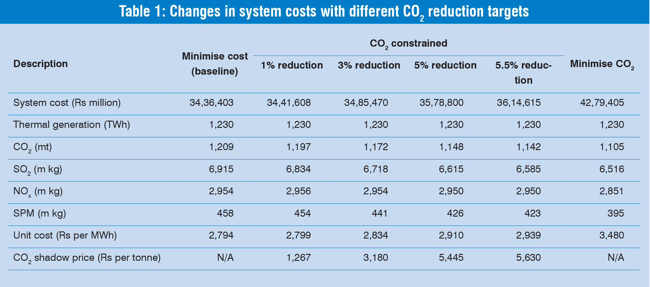 It can be observed from the results that for a very shallow cut at 1 per cent (or 12 mt of CO2 per annum), there is a negligible increase in system cost at approximately 0.15 per cent. It can also be seen that a 5 per cent reduction (60 mt of CO2 per annum) could be achieved through more expensive re-dispatch involving a coal-to-gas switch, for which the cost would increase by Rs 143 billion.