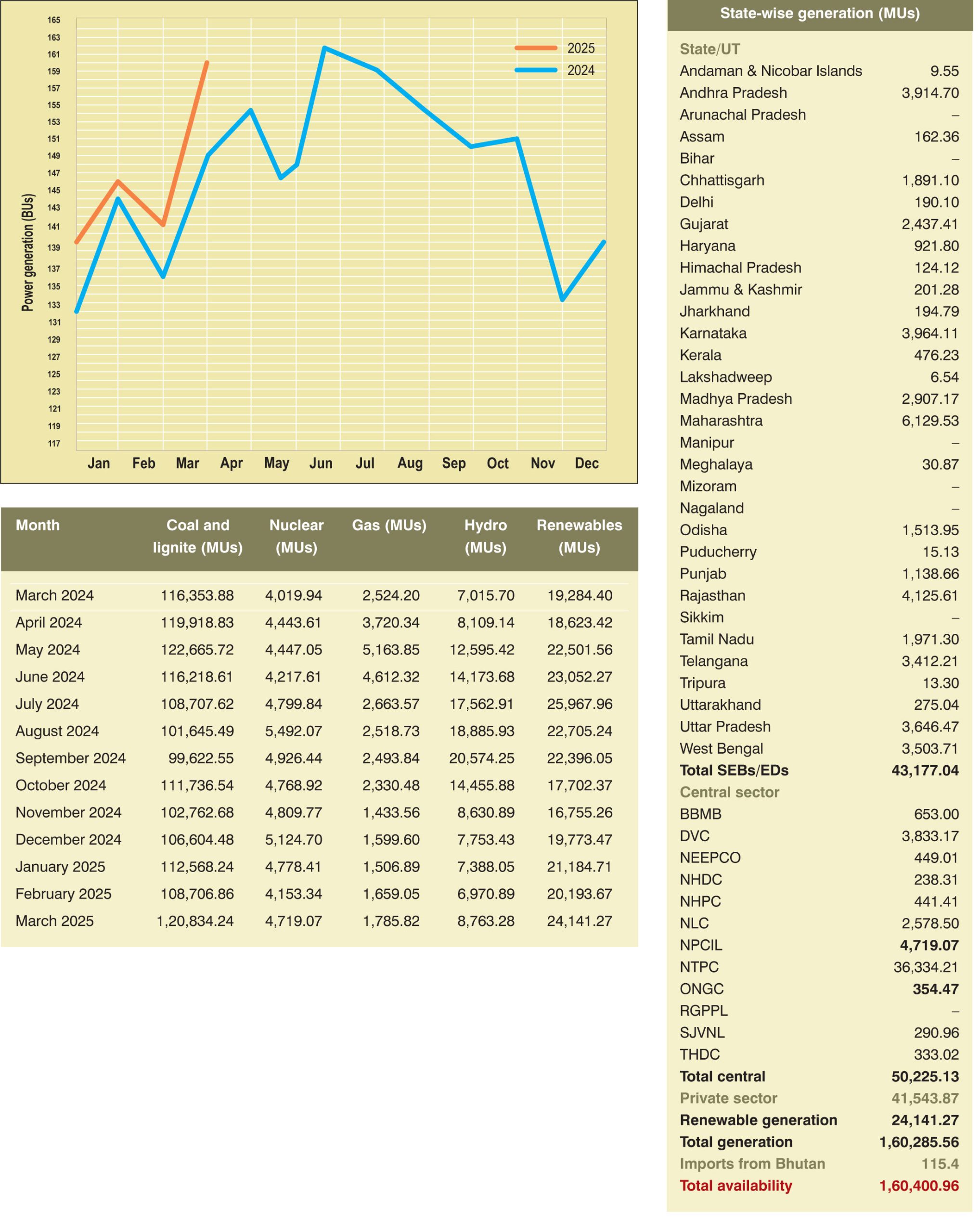 Total power generation stood at 160.23 BUs in March 2025. At around 50.23 BUs and 43.18 BUs, the central and state sectors respectively accounted for the major share in conventional power generation. Meanwhile, renewable energy generation stood at 24,141.27 MUs.