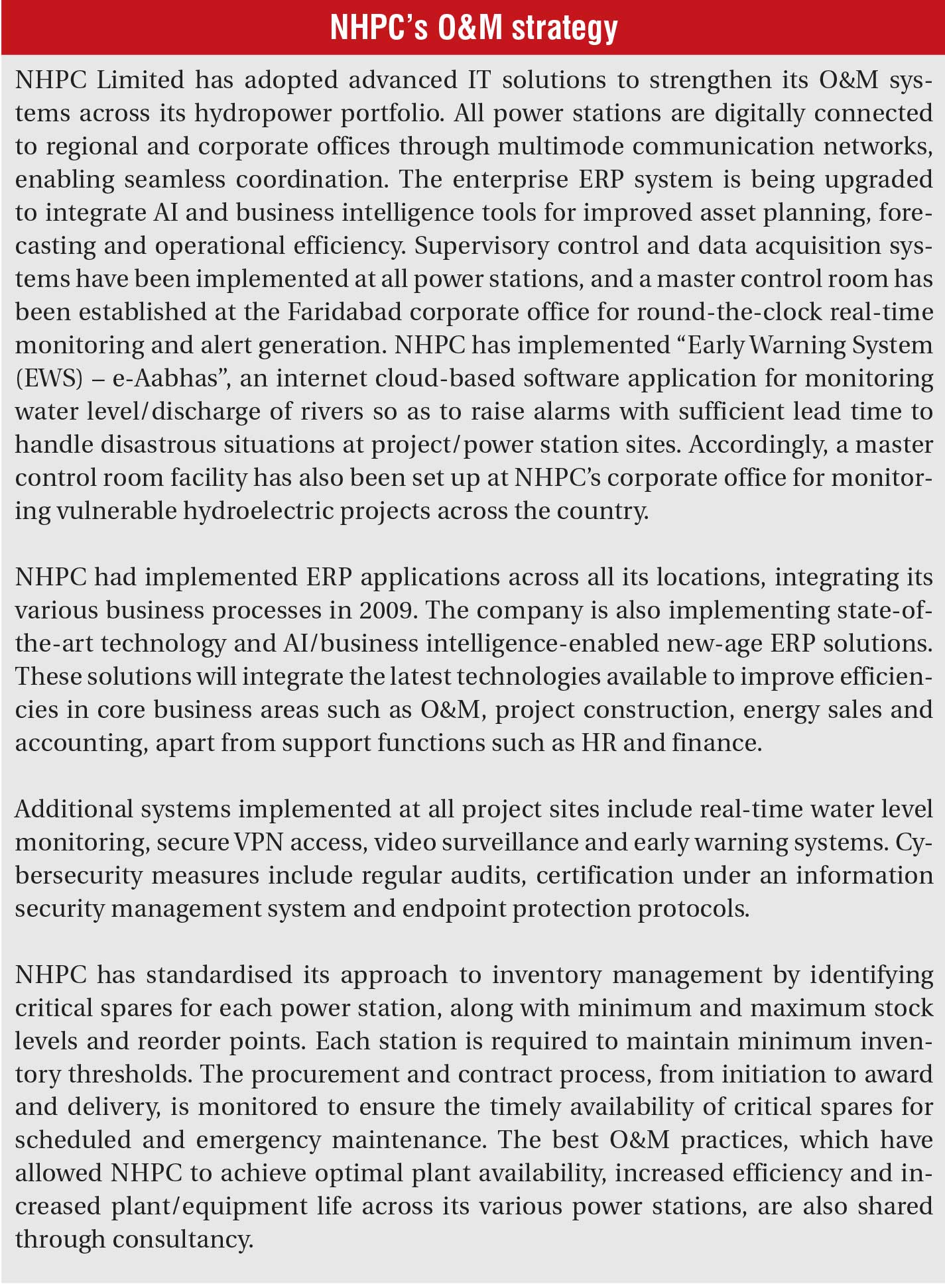 Operations and maintenance (O&M) is a critical function in the life cycle of hydropower plants, directly impacting plant reliability, efficiency and performance. Structured and technology-driven O&M strategies are essential to minimise downtime, manage costs and ensure regulatory compliance. With hydropower playing a growing role in balancing the grid amid rising renewable integration, the importance of predictive and condition-based maintenance is increasing. Challenges such as ageing infrastructure, sedimentation and inflexible grid operations require continuous upgrades in O&M practices. The emergence of pumped storage projects (PSPs) adds further complexity due to their distinct operational demands. Utilities are increasingly adopting digital tools, remote monitoring systems and standardised asset management frameworks to manage their hydropower portfolios more efficiently.