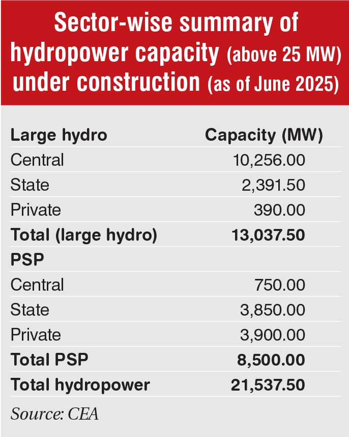 As of June 2025, large hydro power projects (including PSPs) with a total capacity of 21,537 MW are under construction. Of this, 11,006 MW is in the central sector, 6,241.5 MW in the state sector and 4,290 MW in the private sector. Of the total capacity, around 1,820 MW of hydropower capacity is anticipated to be commissioned in 2025-26.