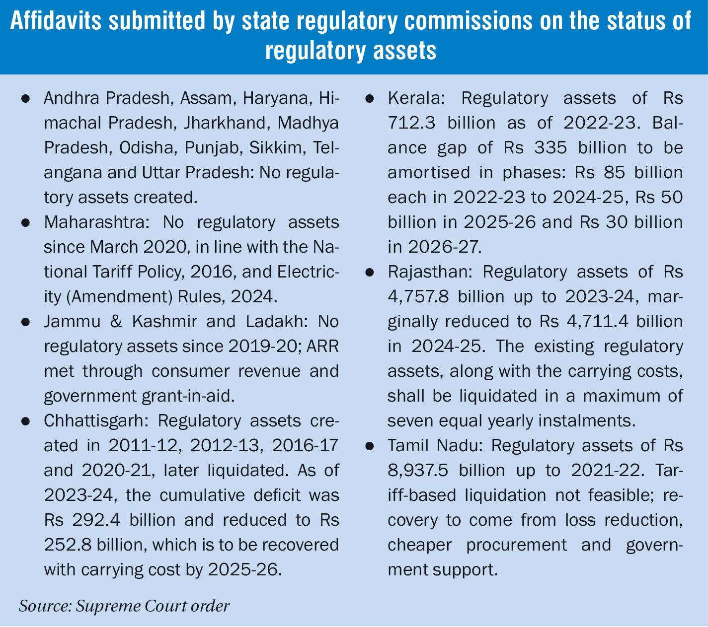 The Supreme Court order was issued in response to civil appeals and writ petitions, wherein Delhi’s three discoms – BSES Rajdhani Power Limited (BRPL), BSES Yamuna Power Limited (BYPL) and Tata Power Delhi Distribution Limited (Tata Power-DDL) – challenged the manner in which the Delhi Electricity Regulatory Commission set retail supply tariffs, leading to the creation and continuation of regulatory assets. As of March 31, 2024, the regulatory assets (including carrying costs) stood at Rs 129.93 billion for BRPL, Rs 84.19 billion for BYPL and Rs 57.88 billion for Tata Power-DDL, aggregating to Rs 272 billion. The problem of regulatory asset build-up is not new and has reached alarming levels over time. Rajasthan has reported regulatory assets of Rs 471 billion as of FY 2025, Kerala reported Rs 71.23 billion as of FY 2023 and Chhattisgarh reported a cumulative deficit of Rs 29 billion as of FY 2024, among others.