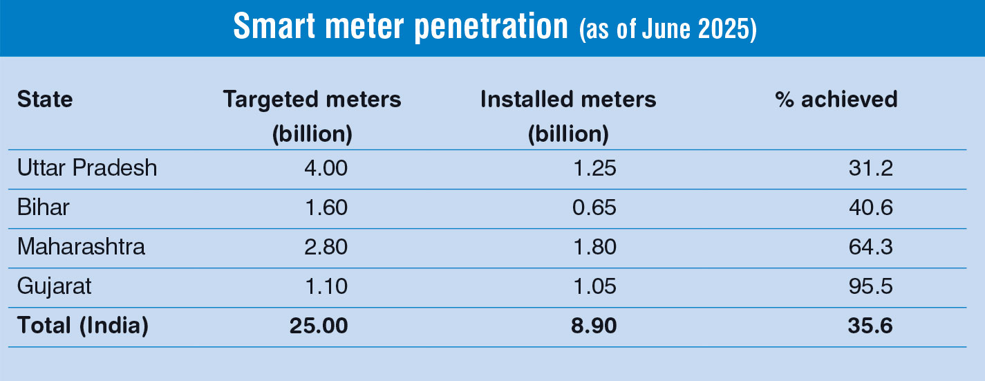The RDSS: Launched for the period FY 2021-26 and likely to be extended to FY 2028, the RDSS was funded with over Rs 3.03 trillion, including more than Rs 97.6 billion in central budgetary support. Its primary goal is to reduce AT&C losses to between 12 and 15 per cent and to eliminate the average cost of supply (ACS)-average revenue realised (ARR) gap by FY 2024-25. The scheme also mandates the deployment of 250 million smart or prepaid consumer meters, along with distribution transformer and feeder metering systems. However, as of early 2025, progress has been slow, with only about 19-21 million consumer smart meters installed – roughly 8 per cent of the target. In addition, the scheme provides for capacity-building and infrastructure modernisation support under its Part A and Part B components.